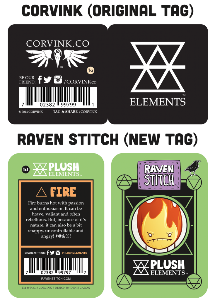 Nothing about the plush themselves will change. The only difference is the hang tags will now be Raven Stitch tags instead of Corvink. Both the Corvink and Raven Stitch plush will still have the First Editions markers, however this will just make the Plush Elements Kickstarter release and a few hundred other plush sold during pre-orders and at conventions more “rare.” If you jumped on board with us early, lucky you! You might have a super rare collectible in your hands! Either way, the first edition run of these is 1000 per plush, so once the first editions are gone, they’re gone.