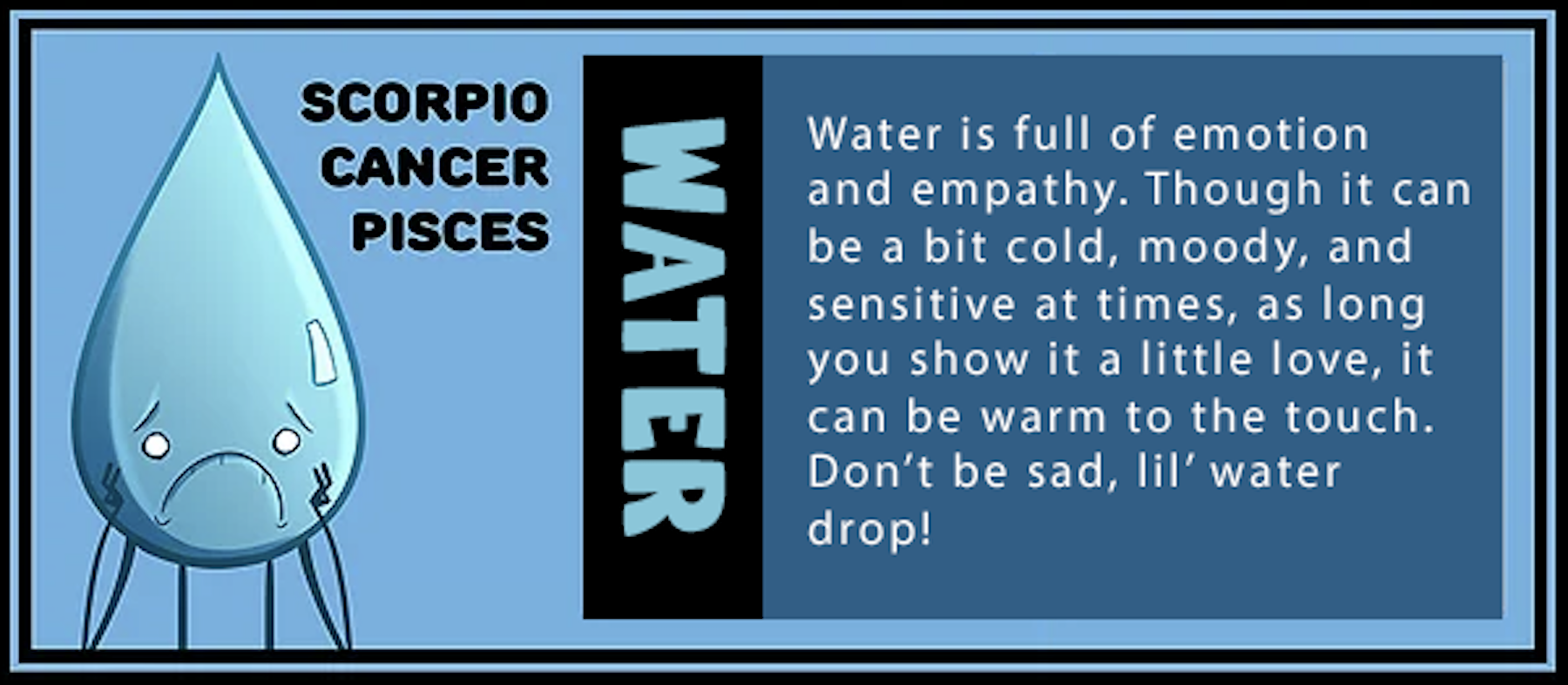 Water elements are full of emotion and empathy. Though they can be a bit cold, moody, and sensitive at times, they can be warm to the touch when shown some love. So if you are a water element, don’t be sad lil’ water drop, it’s ok to feel those emotions, you’re not alone.