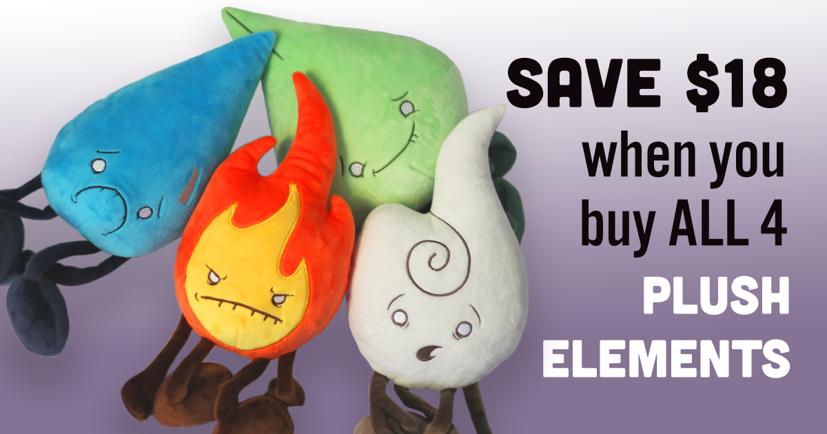 Recently we made an announcement that we are offer free shipping, by adding the cost of shipping into each plush. This works great if you’re only looking to grab one plush, however, if you wanted all 4 the cost of shipping would go up 4x! As that wasn’t our intent, and we want to make sure that everyone can get these at a good price, we’ve now added a new product listing in our store that is a collection of all four elements with free shipping! You can now get Water, Fire, Earth and Air Plush Elements together for $18 OFF (which is basically buy 3 get 1 free)!